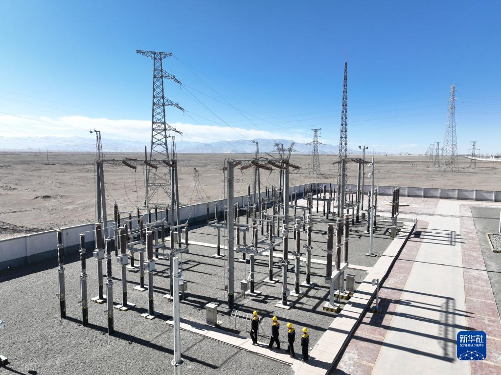 2月5日,中國鐵路青藏集團有限公司西寧供電段格爾木檢修車(chē)間的檢修工在格爾木南變電所巡檢(無(wú)人機照片)。