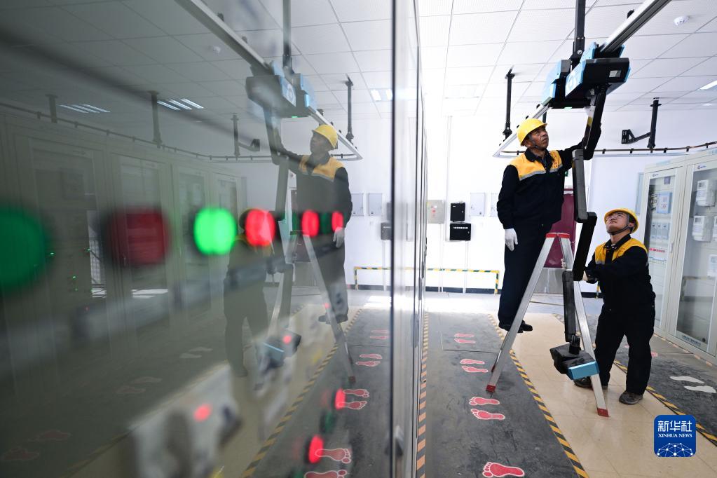 2月5日,中國鐵路青藏集團有限公司西寧供電段格爾木檢修車(chē)間工長(cháng)王永忠(左)在格爾木南變電所查看機器人運行狀況。