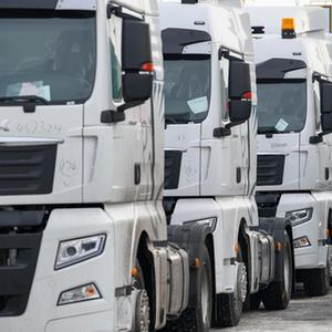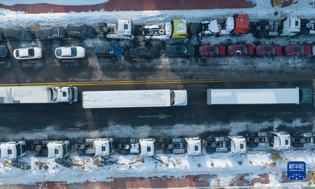 來(lái)自哈薩克斯坦的貨車(chē)、即將出口的車(chē)輛在巴克圖口岸排隊等候出境(2月4日攝,無(wú)人機照片)。