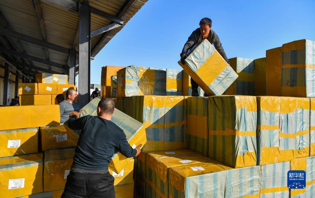 工人在新疆塔城地區一家外貿企業(yè)貨場(chǎng)搬運即將出口哈薩克斯坦的百貨(2月4日攝)。