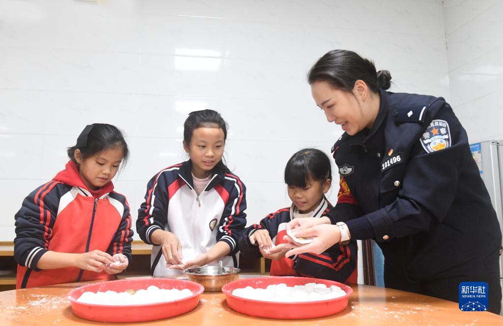 2月5日,在南寧鐵路公安局南寧公安處賓陽(yáng)站派出所,民警與三姐妹一起包湯圓。家住賓陽(yáng)縣和吉鎮三叉村的呂秀清、呂秀萍和呂秀玲三姐妹,是當地的留守兒童,派出所青年民警志愿者常常利用業(yè)余時(shí)間輔導她們學(xué)習,疏導心理,至今已經(jīng)4年。