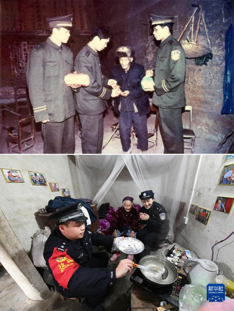 上圖:1990年,原黎塘站派出所(現為賓陽(yáng)站派出所)青年民警看望姚振安老人。新華社發(fā)(賓陽(yáng)站派出所供圖)