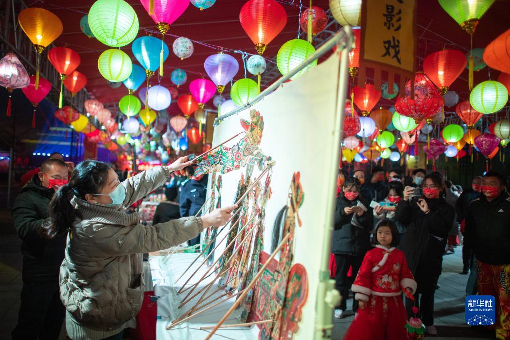 2月5日,市民在湖北省博物館的“鐘鳴楚天元宵夜”燈會(huì )游園活動(dòng)上體驗皮影戲。