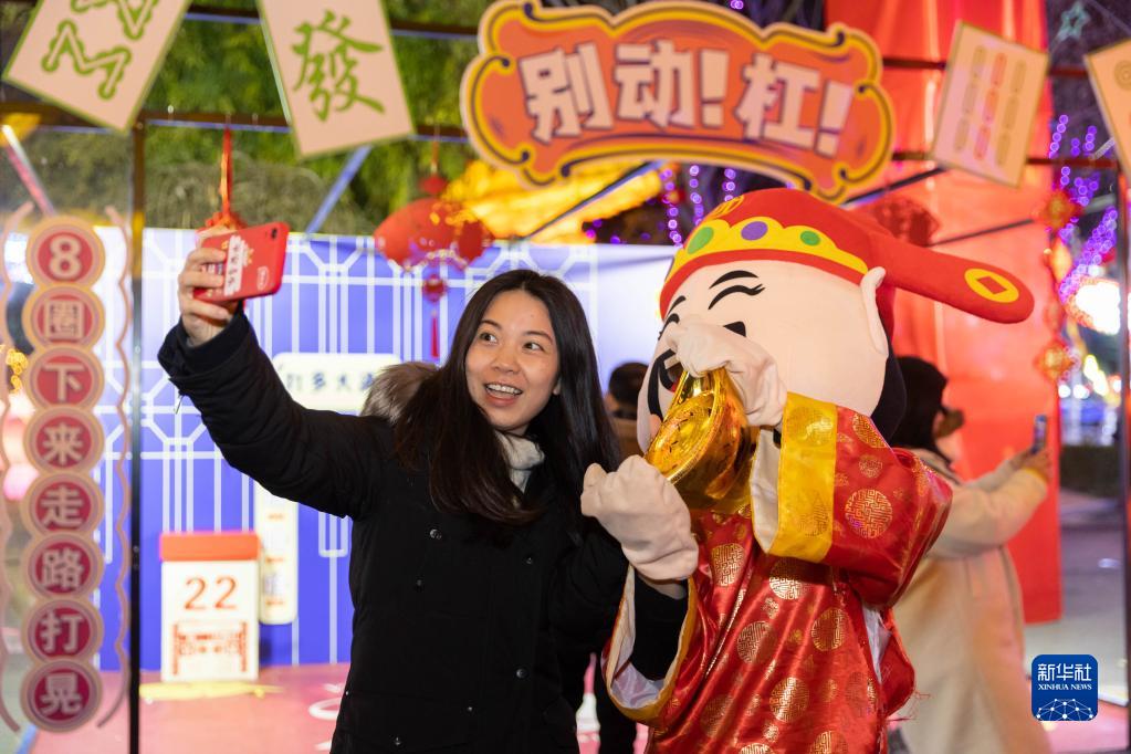 2月4日,在錦江樂(lè )園“盛世唐燈市集”,游客和“財神”自拍合影。