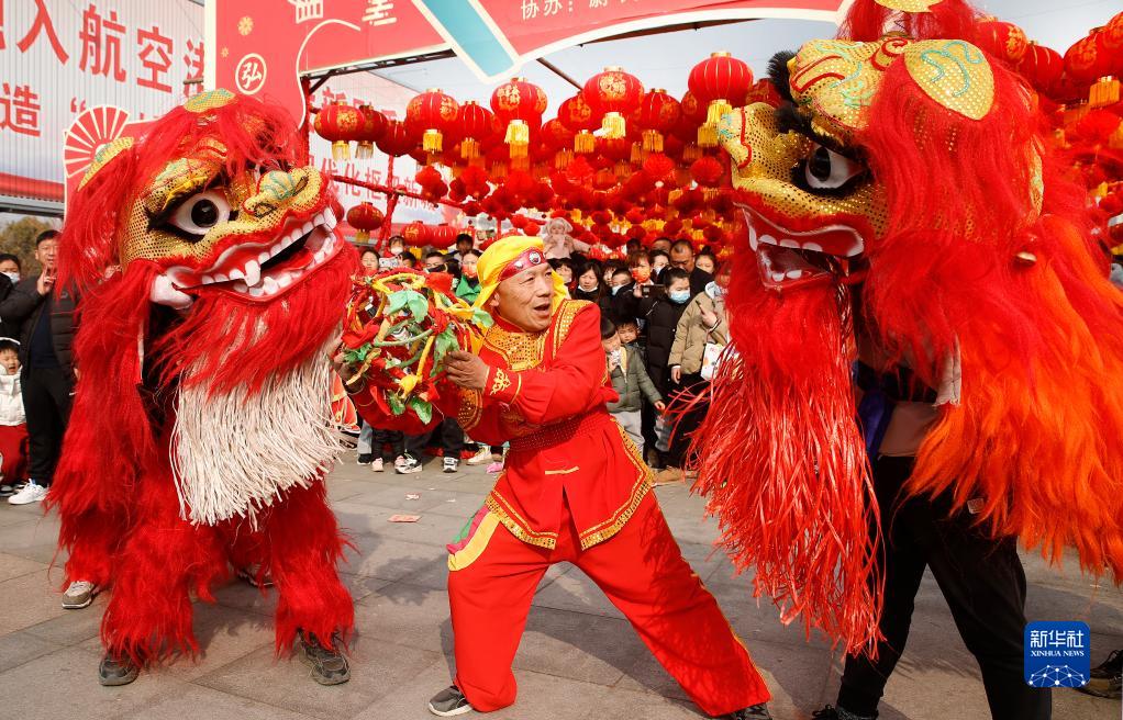 2月5日,在河南省開(kāi)封市尉氏縣兩湖辦事處小西門(mén)村,民間藝人在表演舞獅。