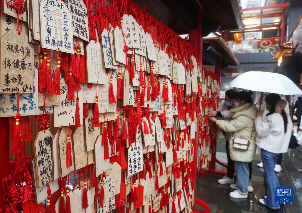 2月5日,游客在南昌市繩金塔歷史文化街區掛祈福牌。