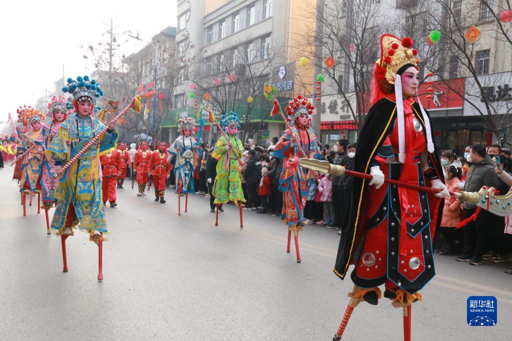 2月5日,在陜西省隴縣,人們在觀(guān)看高蹺社火表演。
