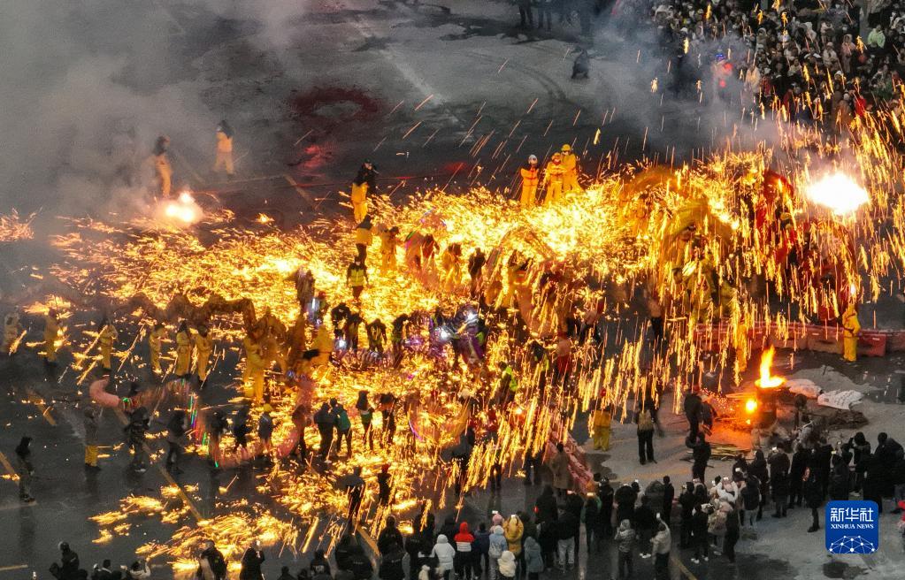 2月5日,在貴州省遵義市新蒲新區新蒲街道中橋村,人們在鐵花中舞龍(無(wú)人機照片)。