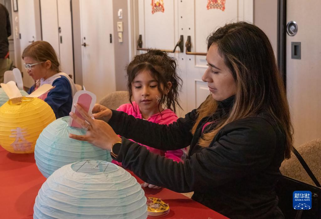 2月4日,在美國得克薩斯州紹斯萊克市的元宵節慶?;顒?dòng)上,人們體驗制作燈籠。