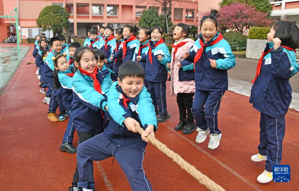 2月6日,在浙江省臺州市仙居縣第一小學(xué)操場(chǎng),學(xué)生參加拔河運動(dòng)。