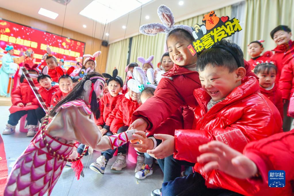 2月6日,浙江省湖州市長(cháng)興縣張家村花園幼兒園,孩子們與提線(xiàn)木偶互動(dòng)。