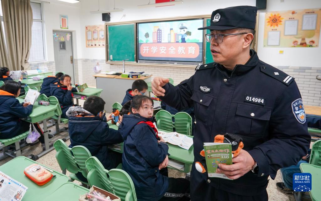 2月6日,在南京市金陵中學(xué)實(shí)驗小學(xué),南京市公安局建鄴分局興隆派出所的民警為同學(xué)講解安全知識。