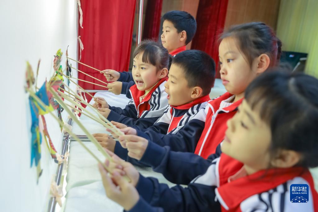 2月6日,學(xué)生在山東省青島市李滄區崇禮小學(xué)體驗皮影戲表演。