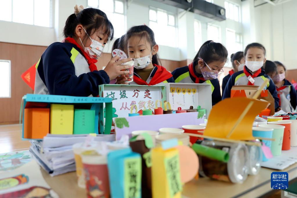 2月6日,在山東省青島西海岸新區第二實(shí)驗小學(xué),學(xué)生參觀(guān)寒假課程成果展。