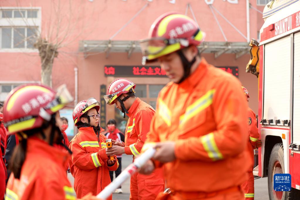 2月6日,在隆堯縣第二實(shí)驗小學(xué),消防員向學(xué)生介紹消防救援設備。