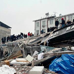 2月6日,人們在土耳其馬拉蒂亞一處倒塌的建筑上搜救。