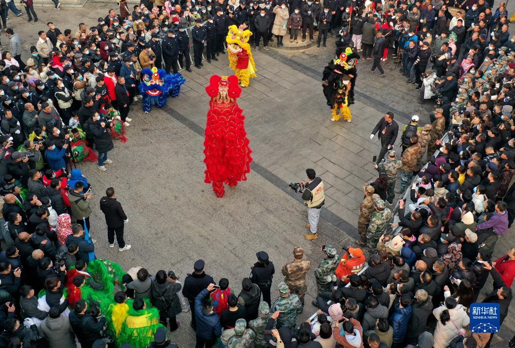 2月6日,社火團隊的演員在廟會(huì )上表演舞獅(無(wú)人機照片)。