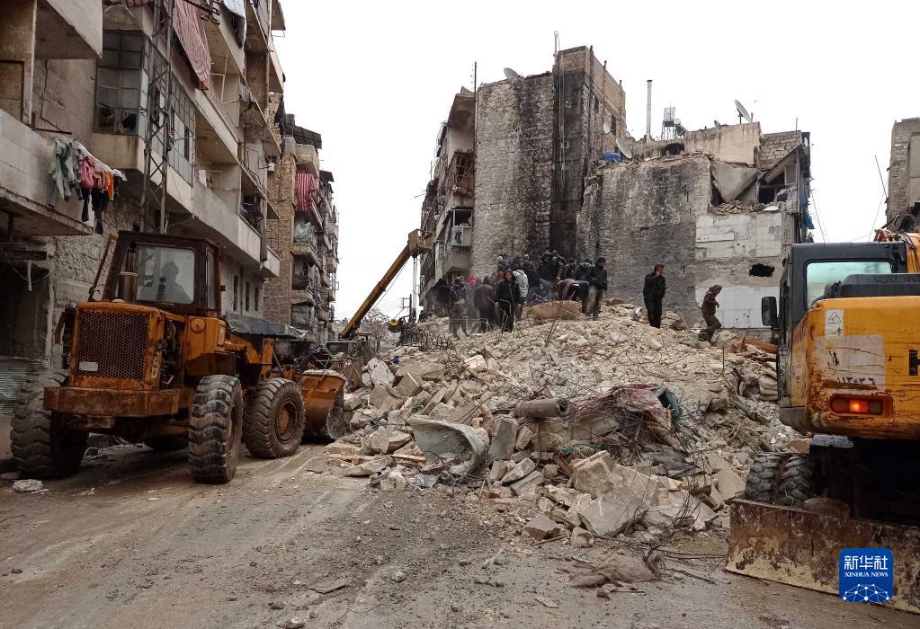 2月6日,人們在敘利亞阿勒頗省一處倒塌的建筑現場(chǎng)進(jìn)行救援。