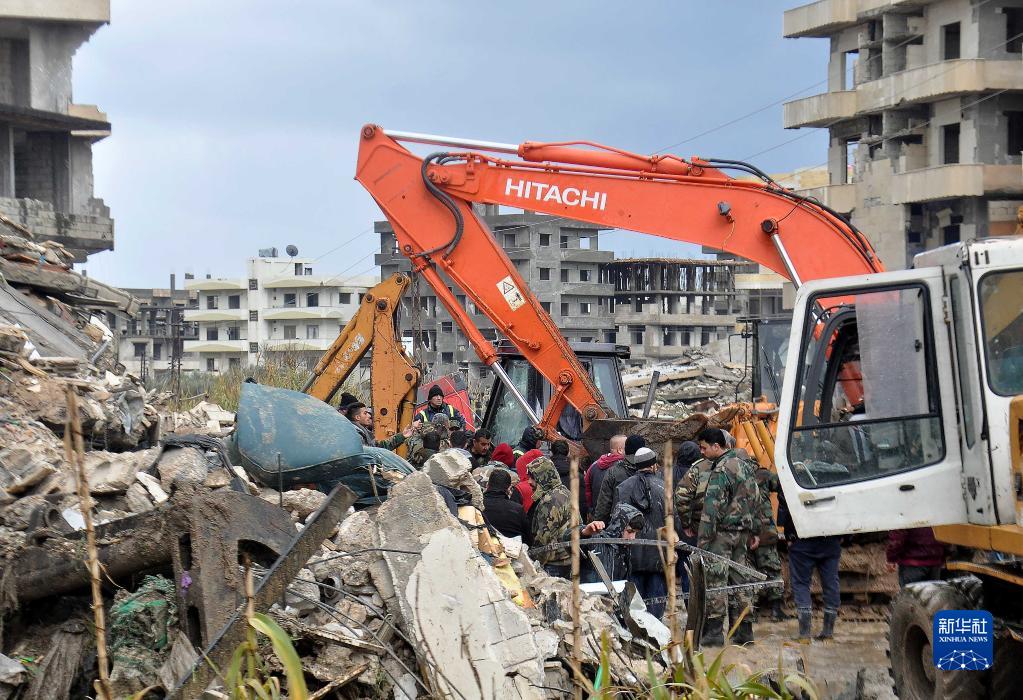 2月6日,在敘利亞拉塔基亞省杰卜萊,人們在一處倒塌的建筑現場(chǎng)進(jìn)行救援。