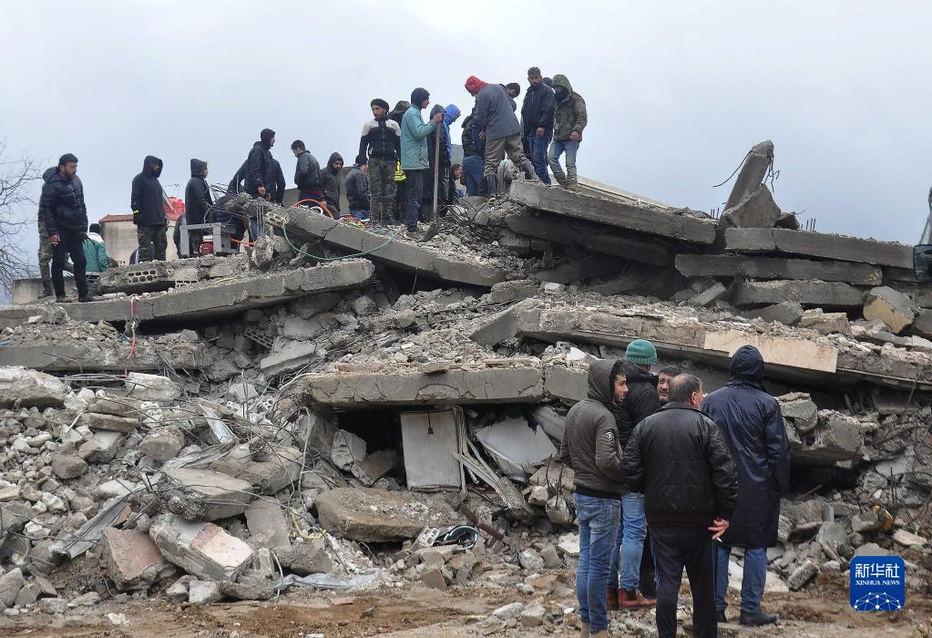2月6日,在敘利亞拉塔基亞省杰卜萊,人們在一處倒塌的建筑現場(chǎng)進(jìn)行救援。