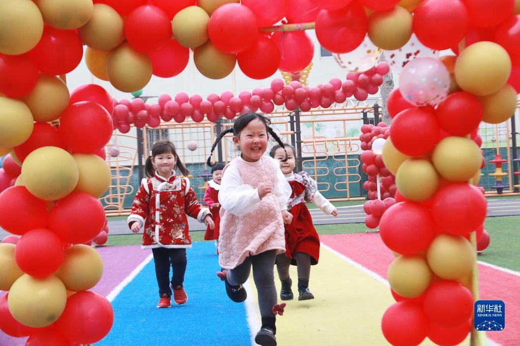 2月7日,山東省高密市金蘋(píng)果幼兒園的孩子們在操場(chǎng)奔跑。