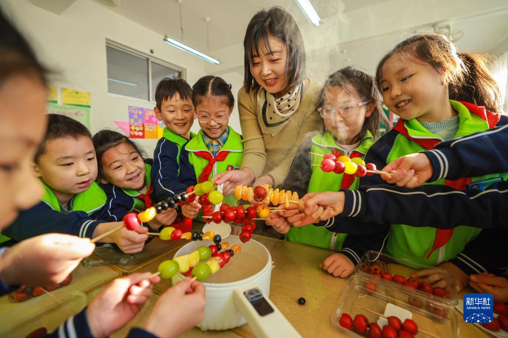 2月7日,山東省榮成市蜊江小學(xué)的師生在教室內制作糖葫蘆。