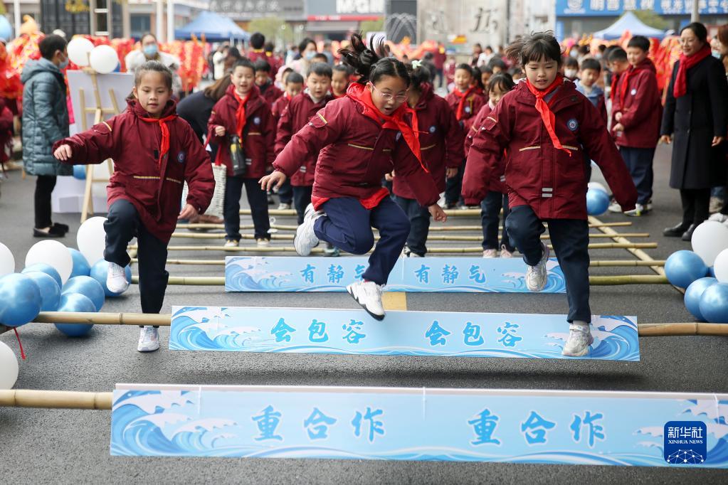 2月7日,浙江省東陽(yáng)市江北中心小學(xué)學(xué)生在春季開(kāi)學(xué)禮現場(chǎng)體驗“跳竹竿”游戲。