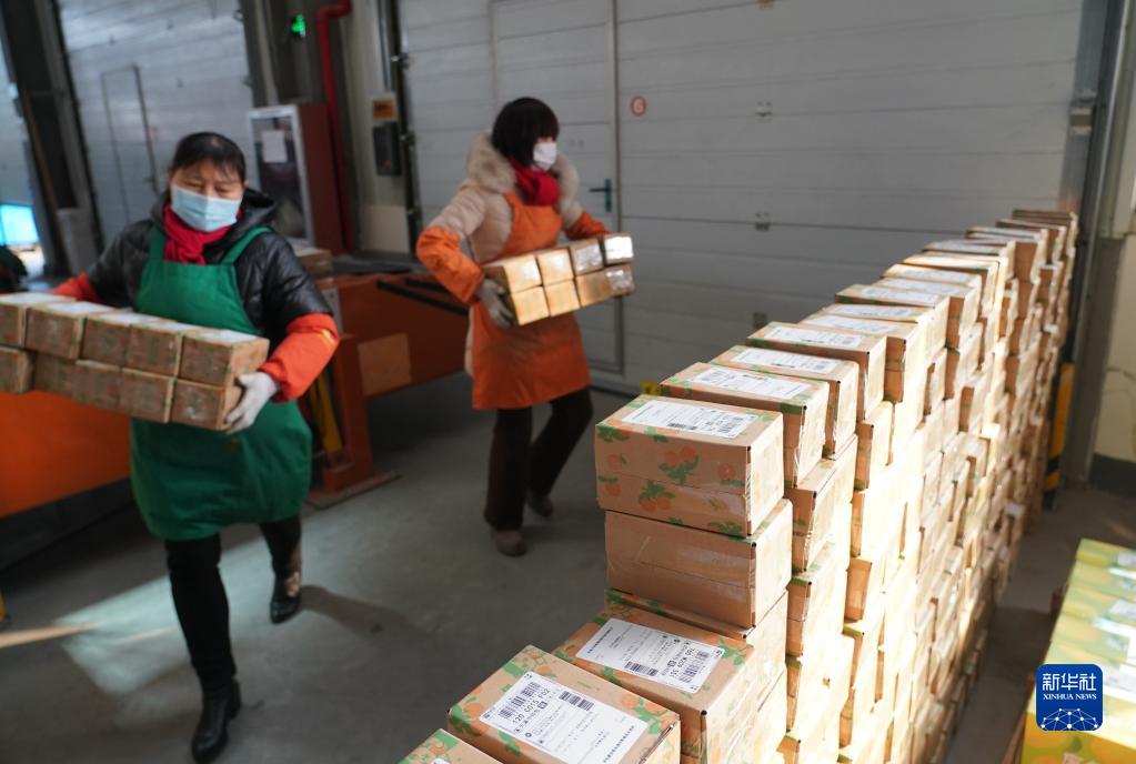 2月6日,在位于武功縣的陜西美農網(wǎng)絡(luò )科技有限公司物流倉,工作人員在堆放快遞包裹。