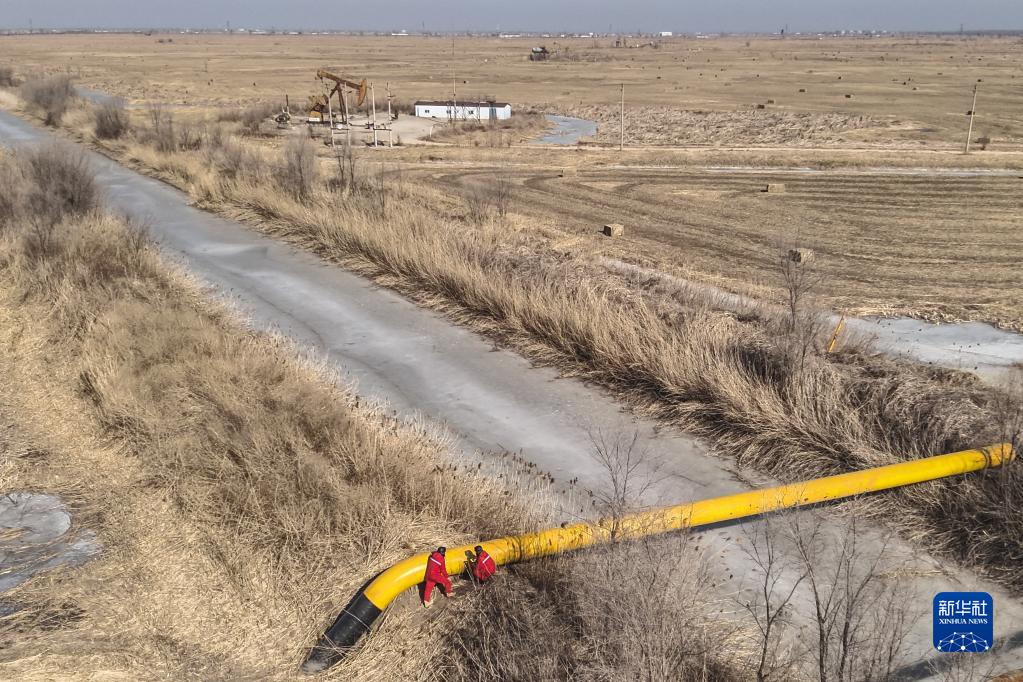 2月6日,中國石油遼河油田興隆臺輸氣分公司巡線(xiàn)工人在進(jìn)行巡線(xiàn)工作(無(wú)人機照片)。