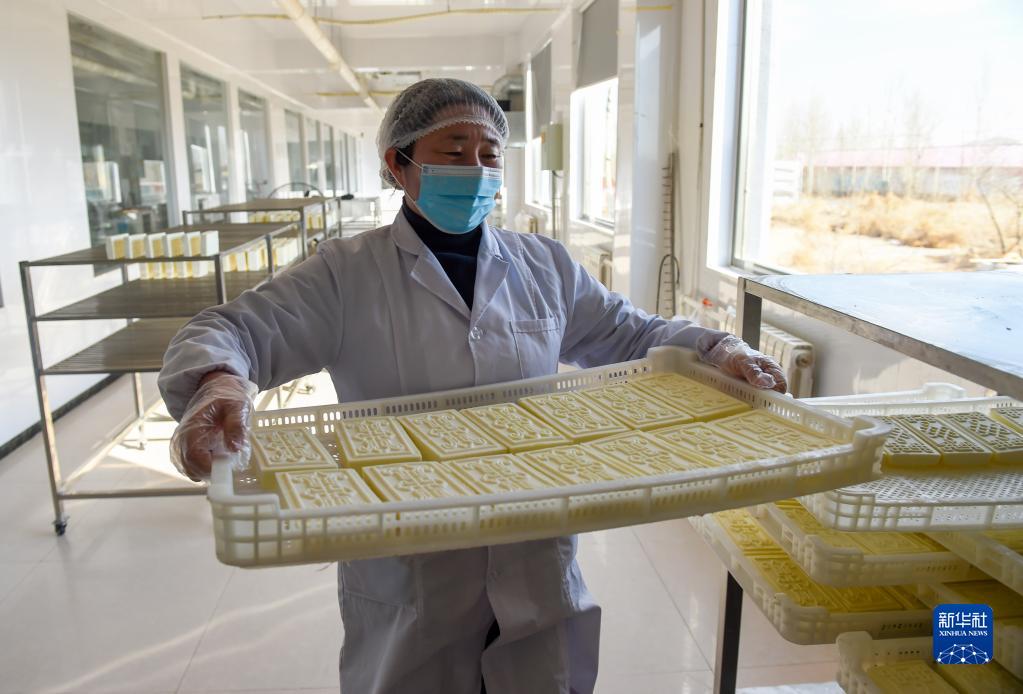 2月6日,工人在內蒙古赤峰市巴林左旗一奶制品有限公司的生產(chǎn)車(chē)間內搬運產(chǎn)品。