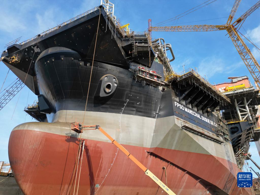 這是2月7日在中集來(lái)福士山東煙臺建造基地拍攝的建造中的大型浮式生產(chǎn)儲卸油船(無(wú)人機照片)。