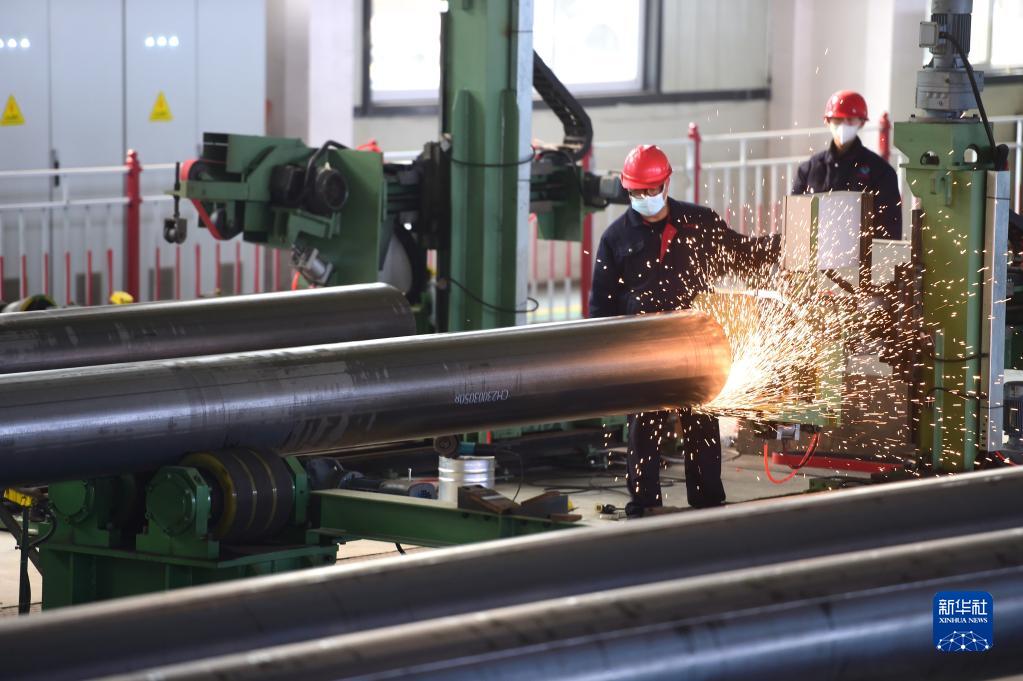 2月7日,河北鹽山縣一家管道企業(yè)的工人在生產(chǎn)輸氣鋼管。