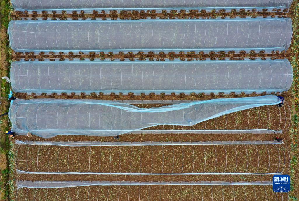 2月7日,在浙江省溫嶺市東浦新塘,西瓜種植戶(hù)在覆蓋西瓜大棚塑料薄膜,準備種植新一季西瓜(無(wú)人機照片)。