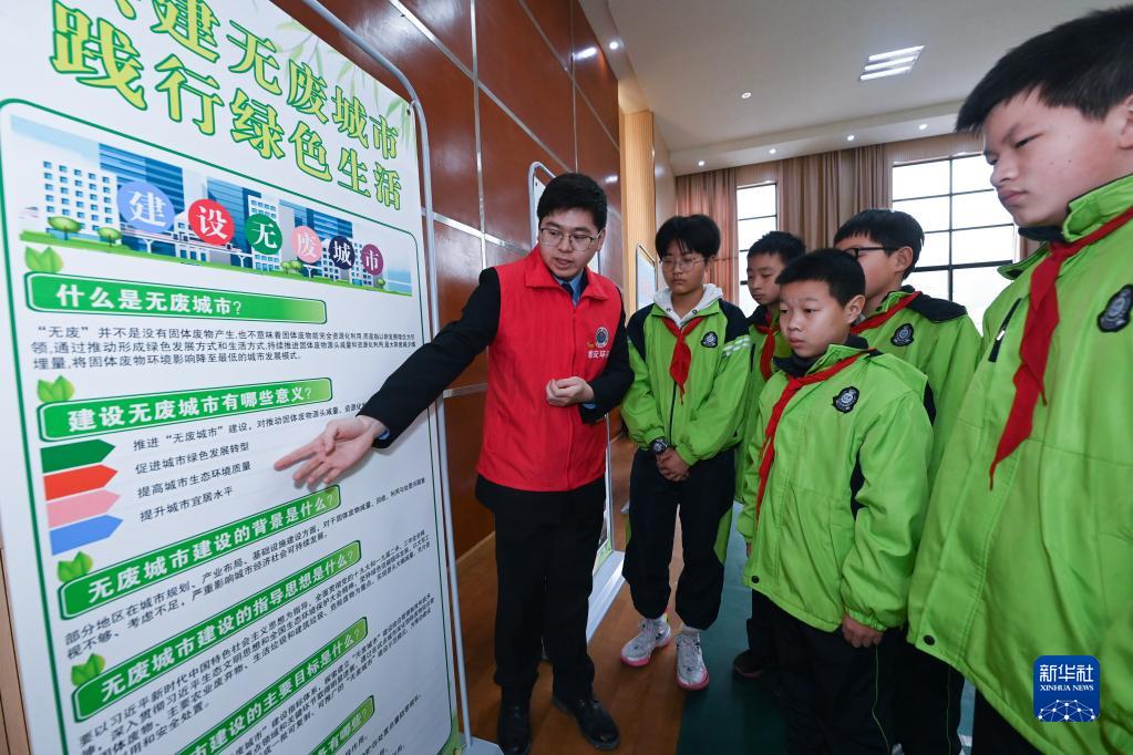 2月7日,在杭州市臨安區潛川鎮的潛川小學(xué),杭州市生態(tài)環(huán)境局臨安分局的黨員志愿者向學(xué)生普及“無(wú)廢城市”的概念。
