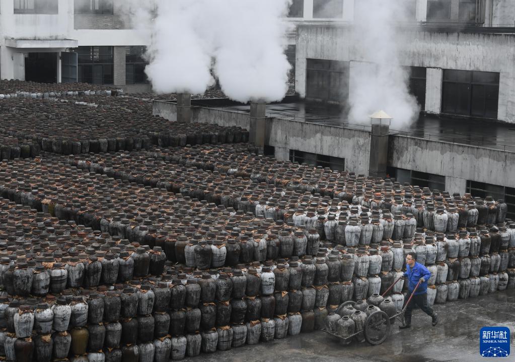 2月7日,工作人員在位于紹興市越城區的古越龍山釀酒一廠(chǎng)運送酒壇。