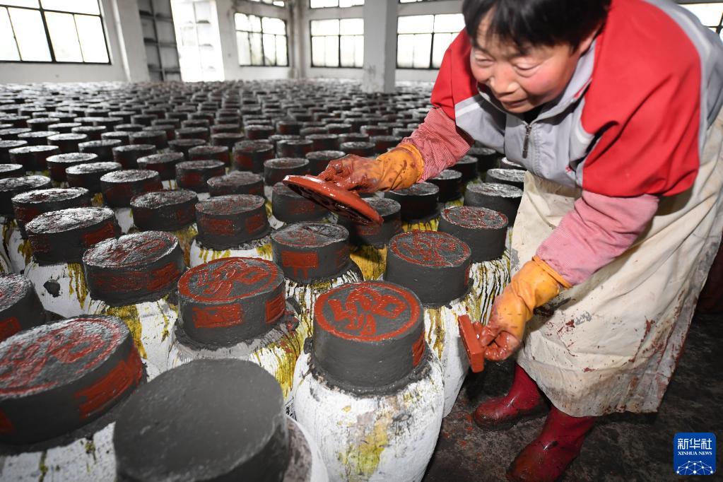 2月7日,在位于紹興市越城區的古越龍山釀酒一廠(chǎng),工作人員為完成春榨的黃酒封泥頭。新華社記者 翁忻旸 攝