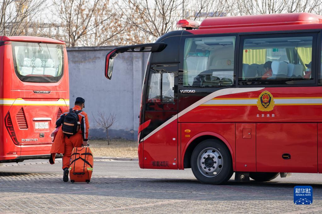 2月7日,中國救援隊隊員在北京大興消防訓練基地準備出發(fā)。