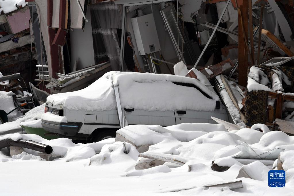 這是2月7日在土耳其卡赫拉曼馬拉什省的埃爾比斯坦地區拍攝的地震中受損的建筑物和車(chē)輛。
