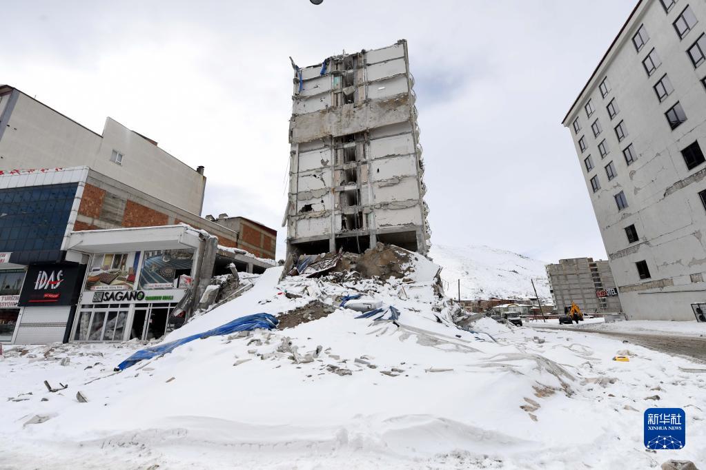 這是2月7日在土耳其卡赫拉曼馬拉什省的埃爾比斯坦地區拍攝的地震中受損的建筑物。