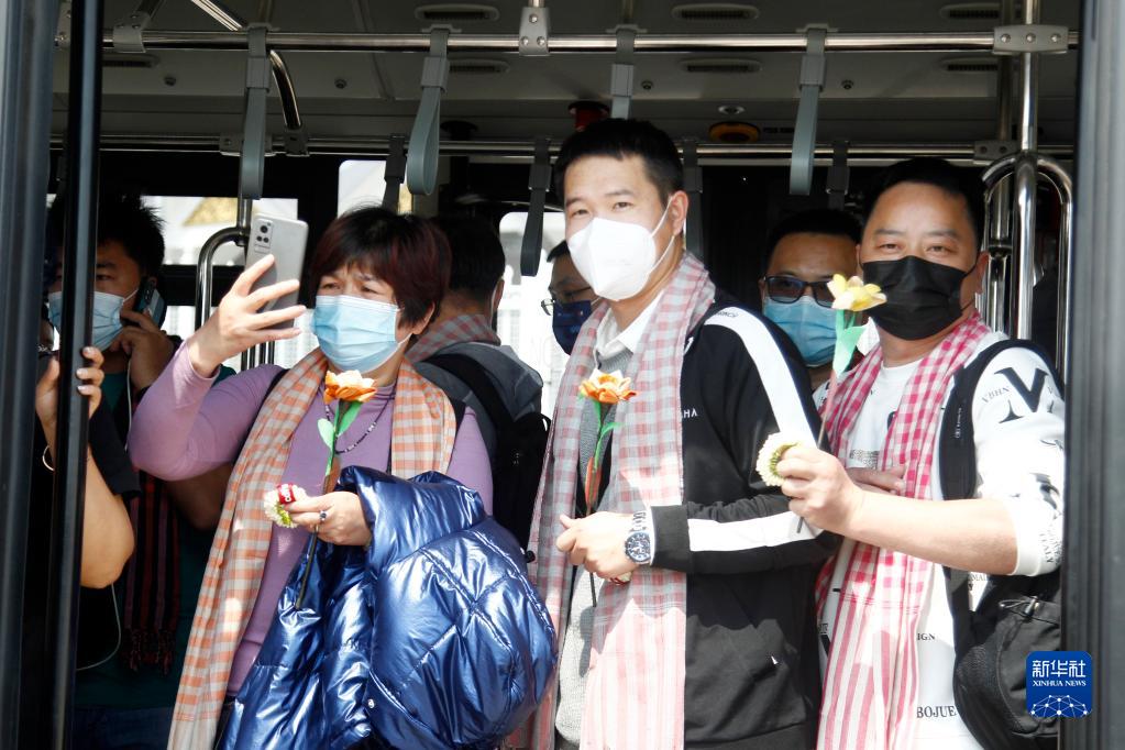 2月7日,一架載有中國乘客的國航航班從北京出發(fā)抵達柬埔寨首都金邊國際機場(chǎng),受到柬埔寨熱烈歡迎。新華社發(fā)(批隆攝)
