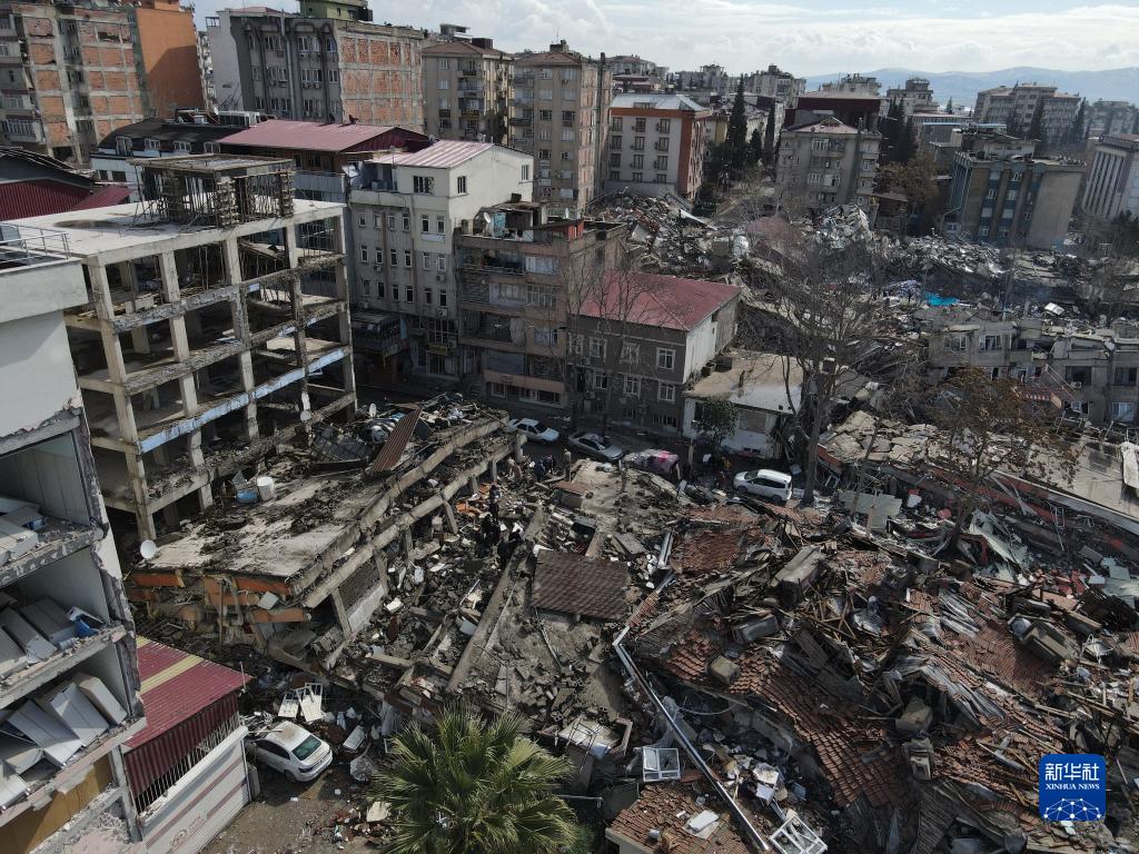 這是2月7日在土耳其南部卡赫拉曼馬拉什市市中心拍攝的震后景象(無(wú)人機照片)??ê绽R拉什市是本次地震重災區卡赫拉曼馬拉什省省會(huì ),是遭受地震破壞最為嚴重的城市之一。
