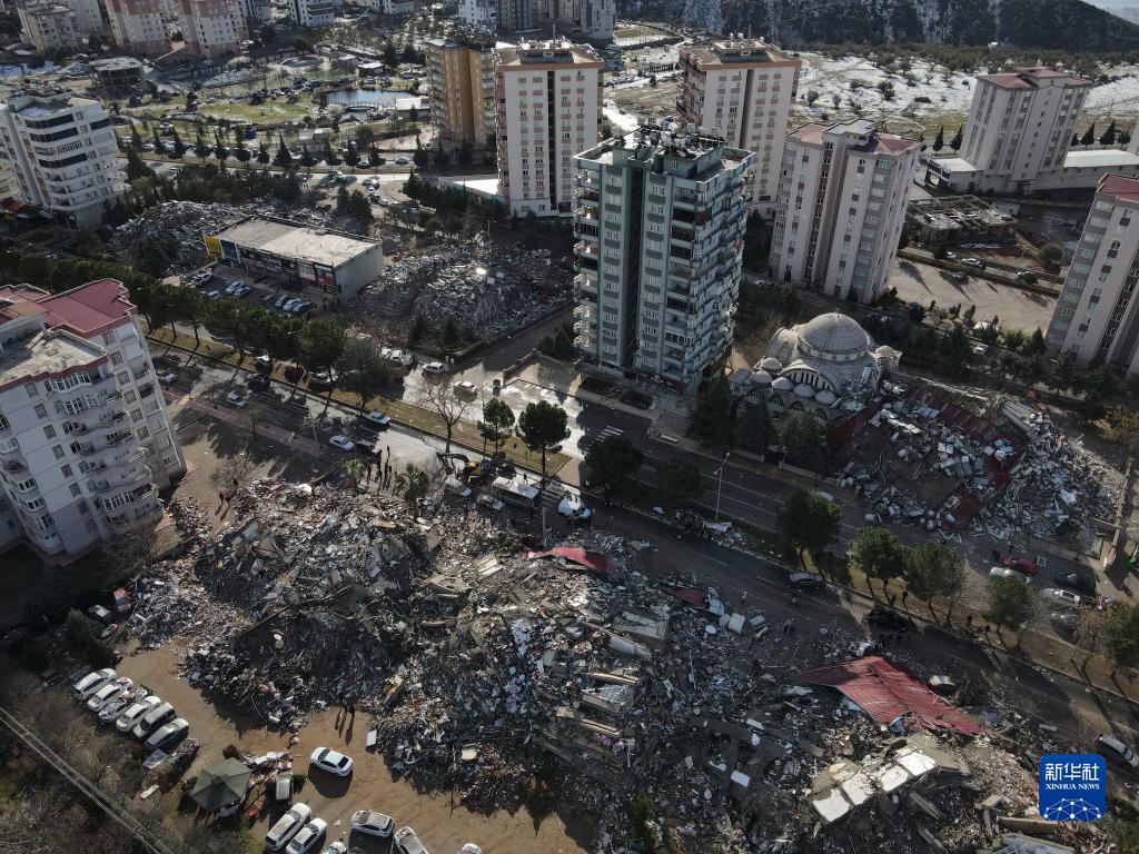 這是2月7日在土耳其南部卡赫拉曼馬拉什市市中心拍攝的震后景象(無(wú)人機照片)??ê绽R拉什市是本次地震重災區卡赫拉曼馬拉什省省會(huì ),是遭受地震破壞最為嚴重的城市之一。