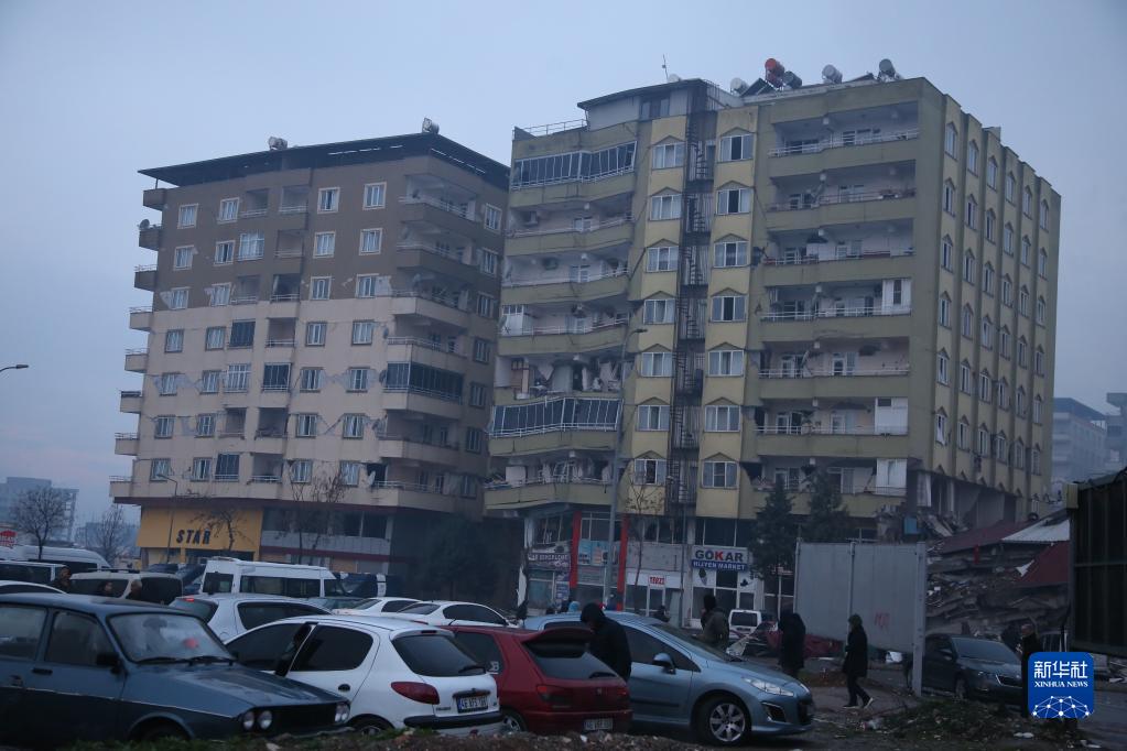 2月7日在土耳其南部卡赫拉曼馬拉什市市中心拍攝的受損的房屋??ê绽R拉什市是本次地震重災區卡赫拉曼馬拉什省省會(huì ),是遭受地震破壞最為嚴重的城市之一。