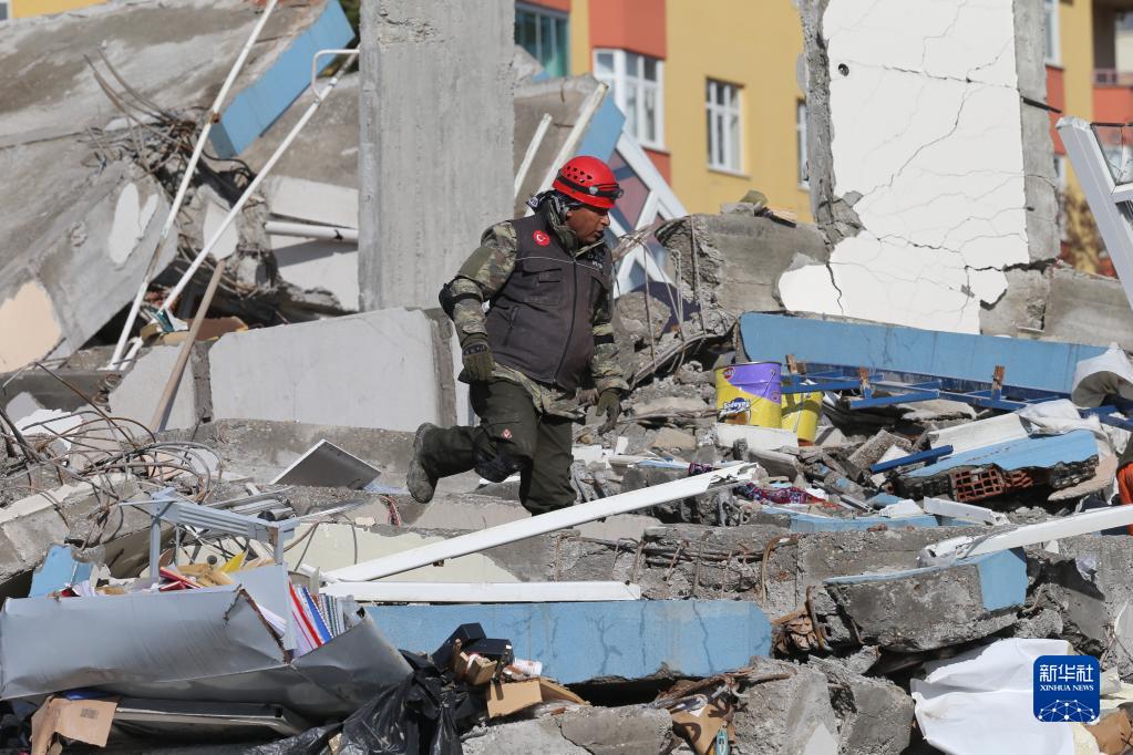 2月7日,救援人員在土耳其南部卡赫拉曼馬拉什市地震廢墟中搜尋幸存者。