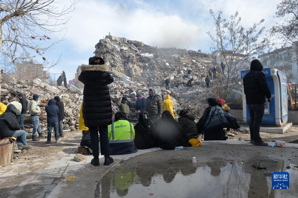 2月7日,災民在土耳其南部卡赫拉曼馬拉什市一處地震廢墟前守候。