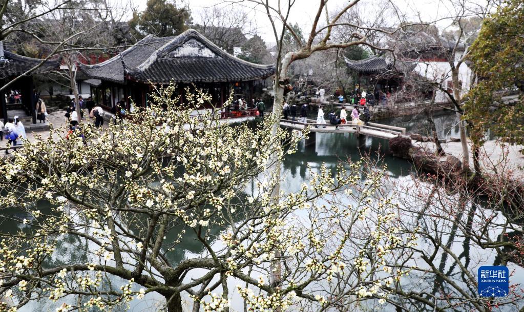 2月7日,游客在江蘇蘇州拙政園賞梅游玩。