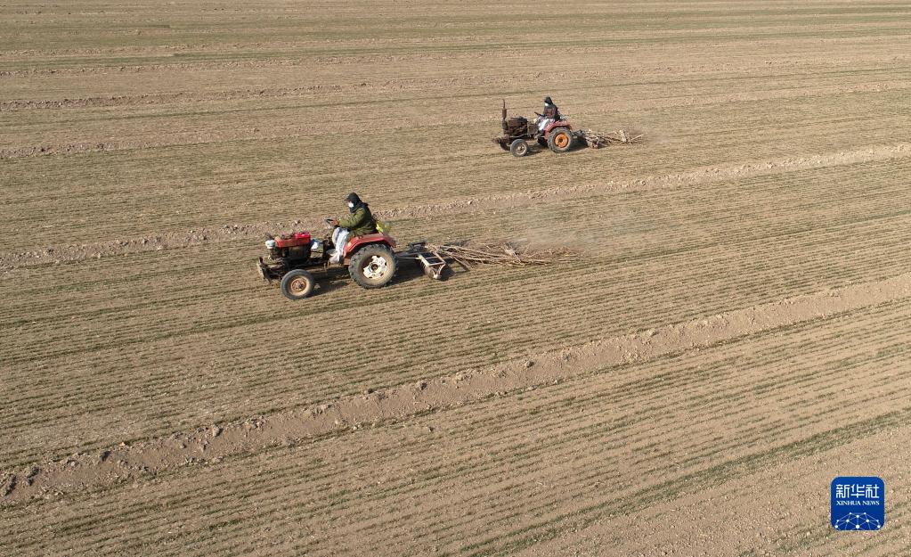 2月8日,大型機械在山東省濱州市惠民縣桑落墅鎮萬(wàn)畝優(yōu)質(zhì)麥種植基地勞作(無(wú)人機照片)。