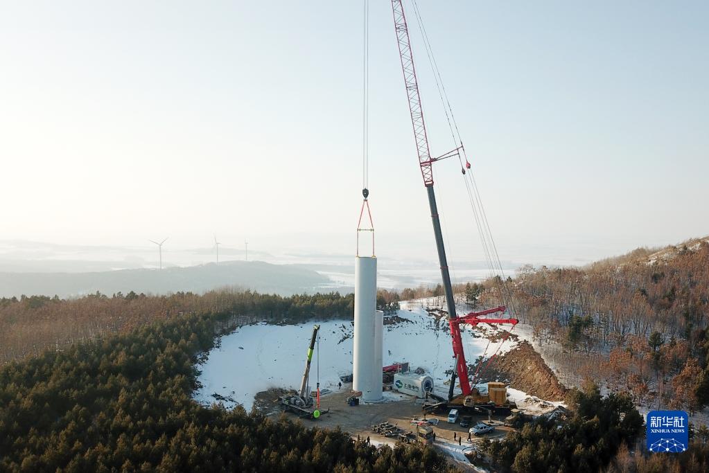 2月7日拍攝的華電黑龍江區域哈爾濱依蘭雞冠山風(fēng)電場(chǎng)三期工程風(fēng)電機組吊裝現場(chǎng)(無(wú)人機照片)。