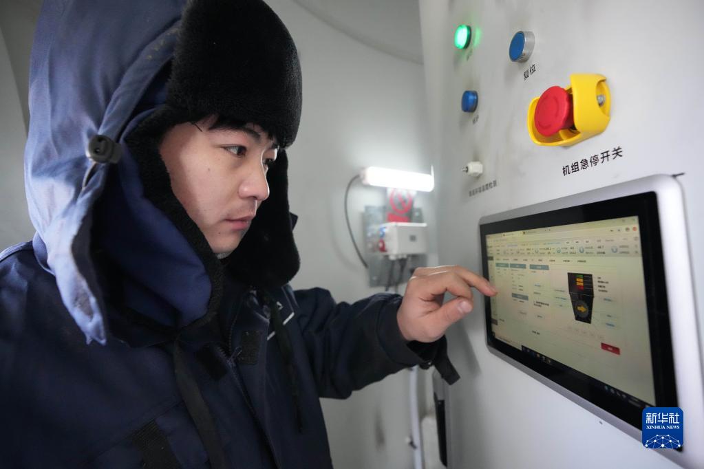 2月7日,在華電黑龍江區域哈爾濱依蘭雞冠山風(fēng)電場(chǎng)三期工程一處運行的風(fēng)電機組,工作人員在進(jìn)行作業(yè)。