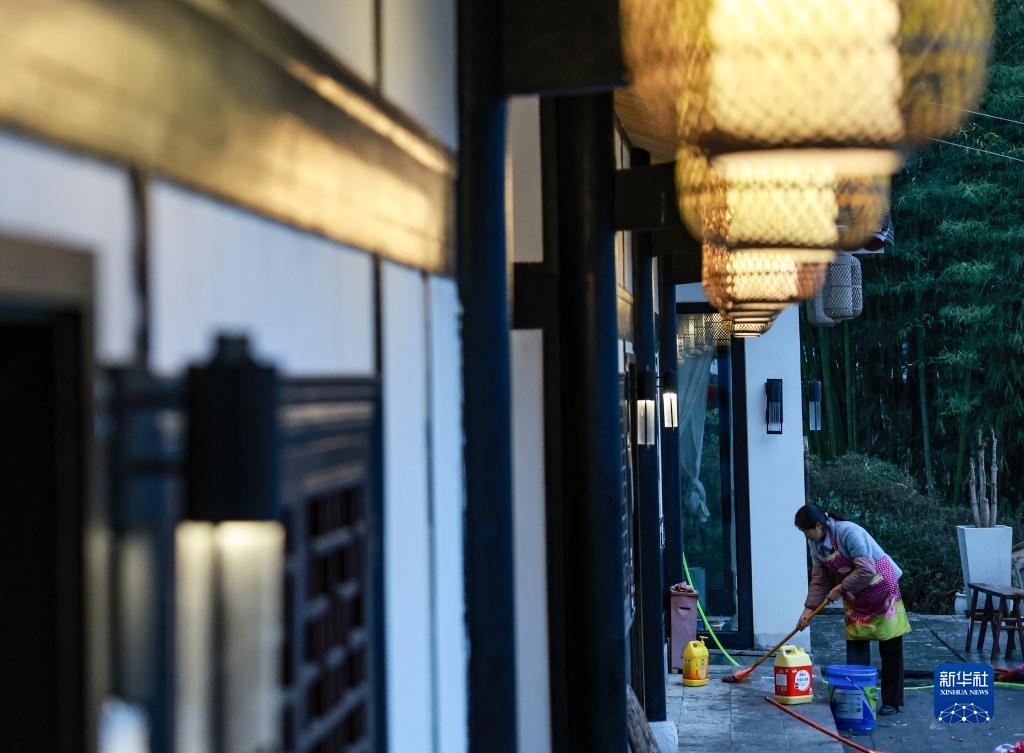 團結村村民在打掃民宿的衛生(2月2日攝)。仁遵高速通車(chē)后,大量游客來(lái)到團結村觀(guān)光旅游。
